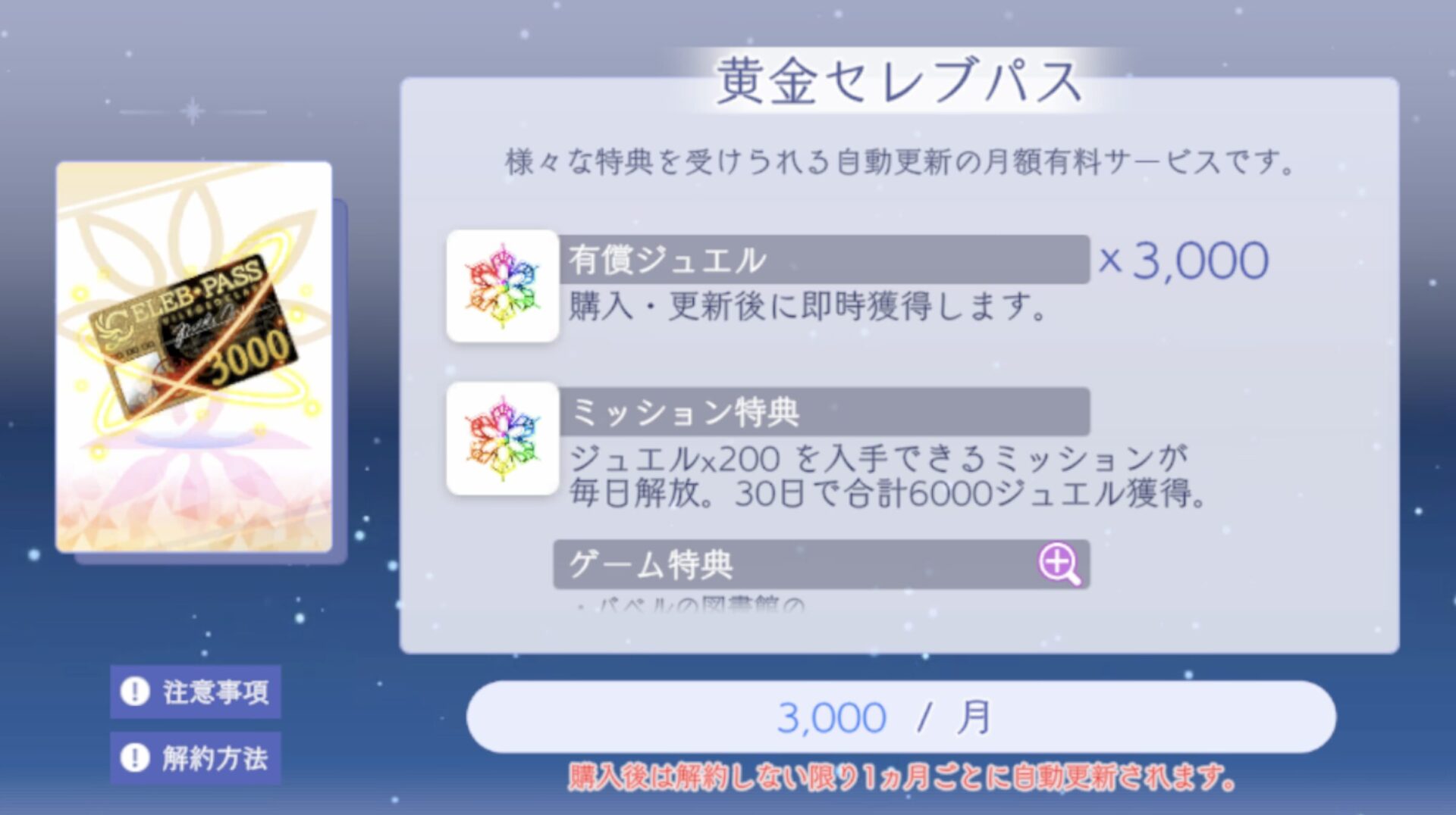 | 内容 | ・購入時:有償ジュエル×3,000 ・30日間:ジュエル×200が入手できるミッションが毎日解放 ・K中間子シリンダーの週間入手上限+10個 ・イベント専用アイテムドロップ数 15%UP ・天使/オーパーツ強化時の必要ガルダ 10%DOWN |